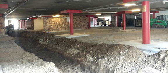 The parking garage has received a much needed makeover. The demolition of the garage concrete was completed during our maintenance week. Over 300 cubic yards of concrete were removed and replaced. The new concrete is five inches thick and was done over four pours. Between each pour and around the footings on each support beam half inch felt expansion joints were installed. The felt allows the concrete to shift, which helps prevent cracking. During the demo process a new slot drain line from the rear garage culvert to the front parking lot had to be installed in order to ensure proper drainage. The old line had a 90 degree angle in it causing backup. The new line is straight from the garage to the inlet by the main entrance planter, which allows much better flow and less chance of clogging. The ADA parking spots were relocated closer to the elevator. The new concrete looks great!